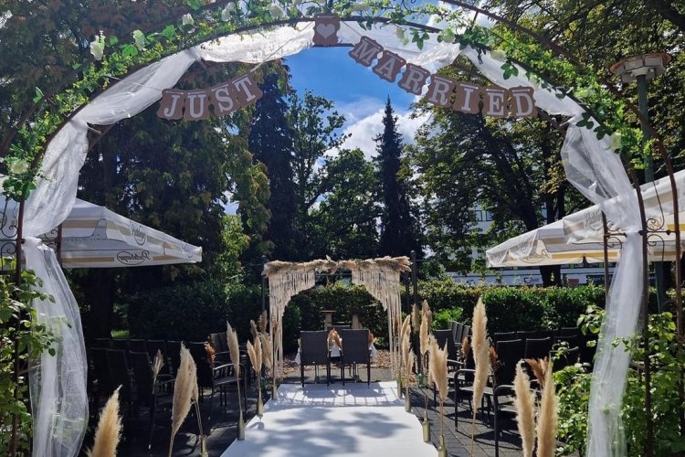 Durch den Zugang zum großzügigen Außenbereich besteht zudem die Möglichkeit mit Ihren Gästen den Sektempfang unter freiem Himmel zu genießen.